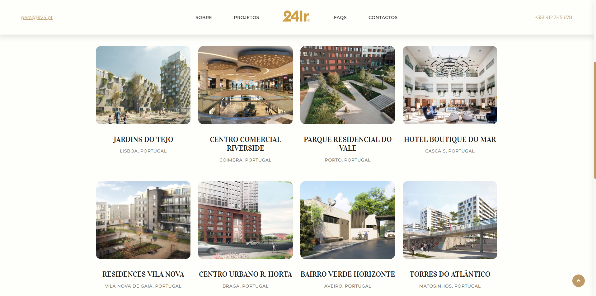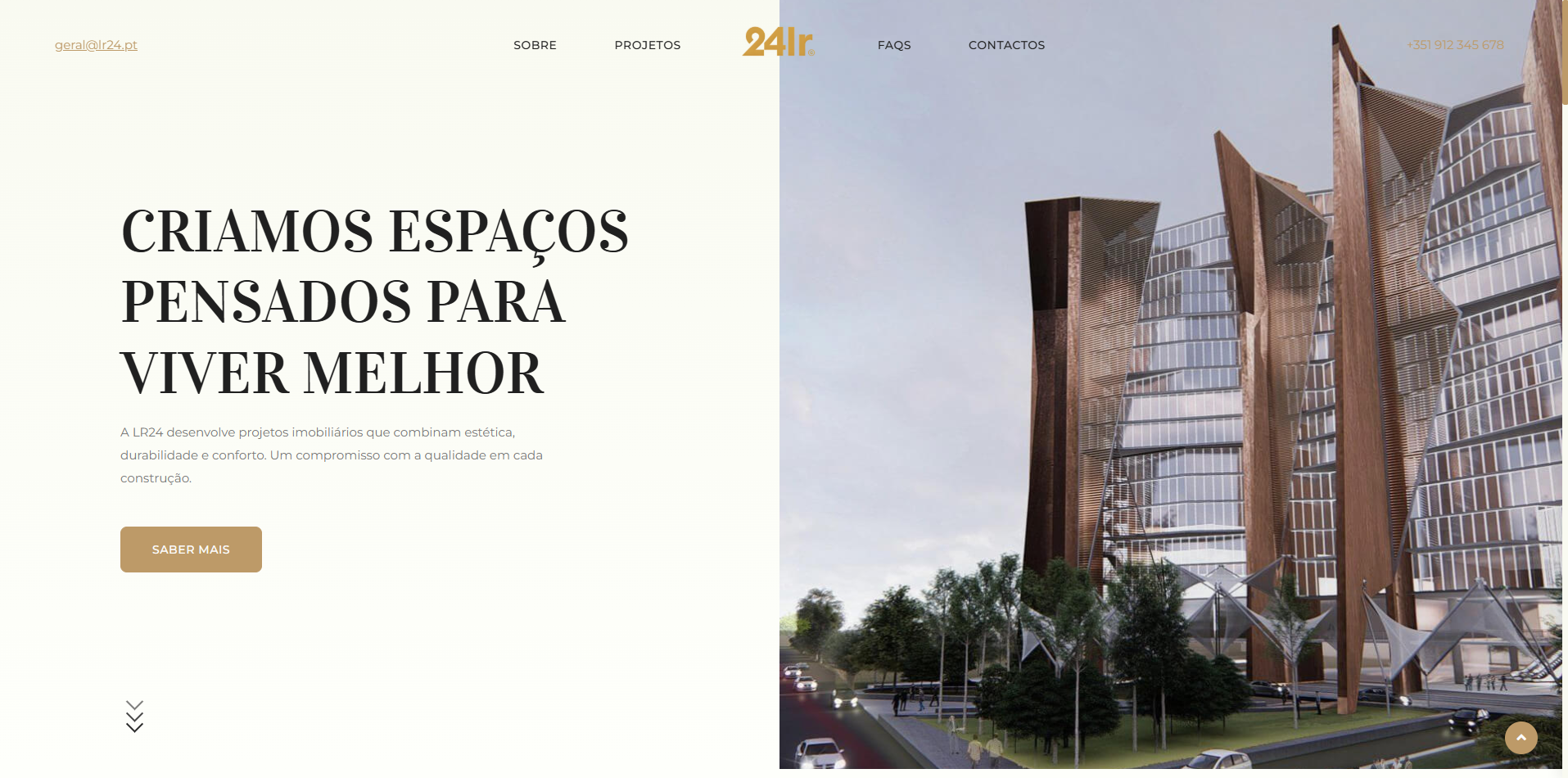Site institucional para a LR24, empresa do setor da construção civil e imobiliário. O website apresenta os serviços de construção e os imóveis disponíveis para venda, com galeria de projetos realizados e informações de contacto. O projeto incluiu também trabalho de branding e identidade visual, com criação de logótipo e linha gráfica.